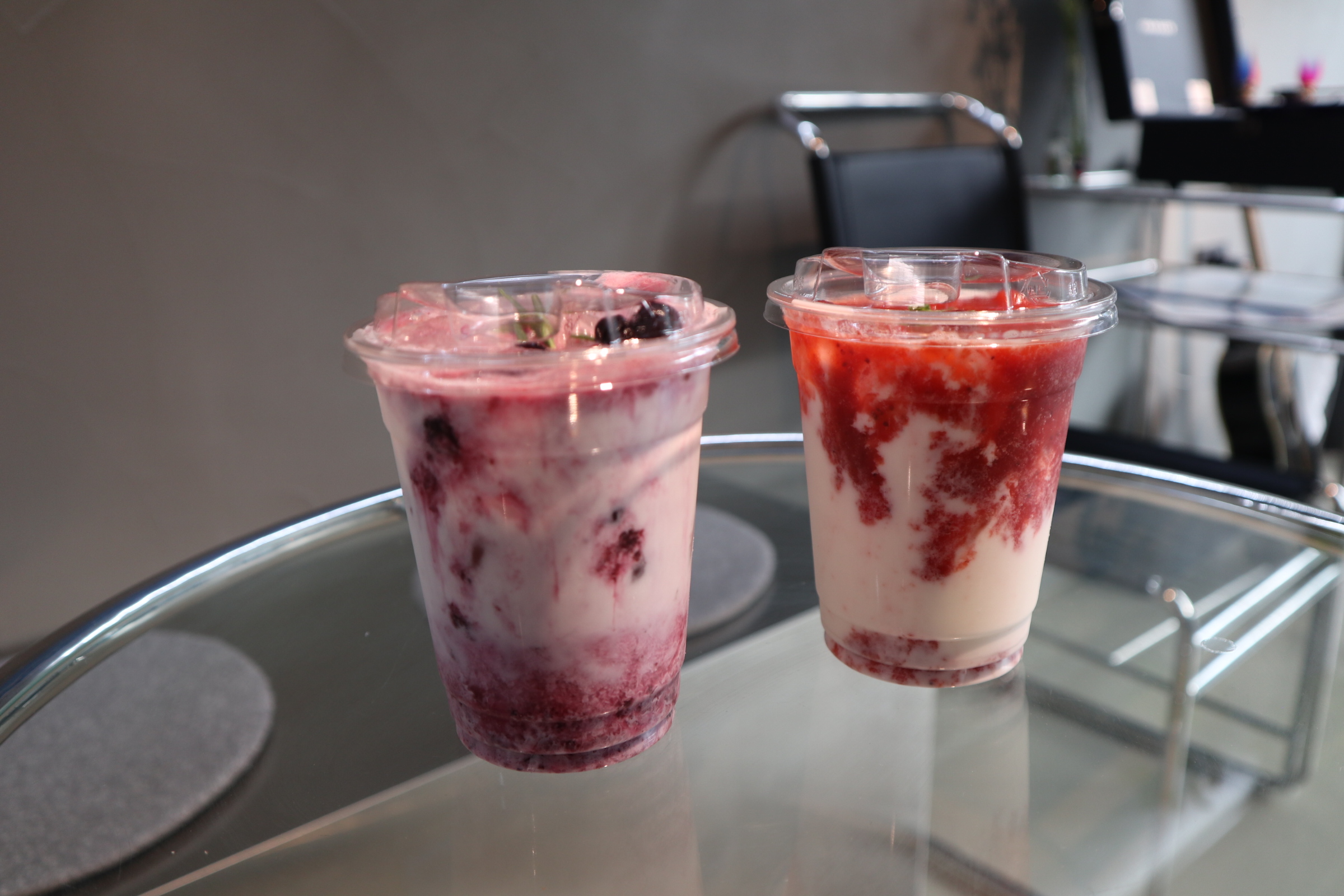 나는 레드라떼와 퍼플라떼를 주문했다. 레드라떼는 딸기라떼, 퍼플라떼는 블루베리라떼